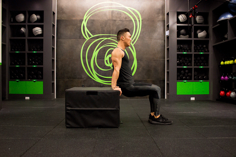 Los principiantes suelen realizar las «flexiones a la inversa», las piernas estiradas o dobladas, con las manos apoyadas en el suelo. Los profesionales apoyan las manos sobre una altura. Los codos deben «mirar» hacia atrás. Desplázate hacia abajo tanto como sea posible, luego asciende de manera que los codos se mantengan ligeramente doblados.