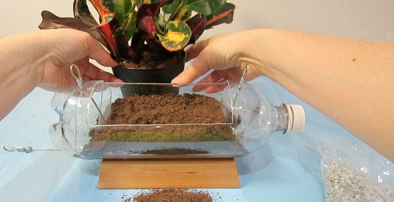 - Haz 8 pinchazos en el fondo de la botella y, para un efecto de drenaje, cubre dicho fondo con grava. Si vas a colgar las botellas o ponerlas en el alféizar de la ventana, procúrate un palet.