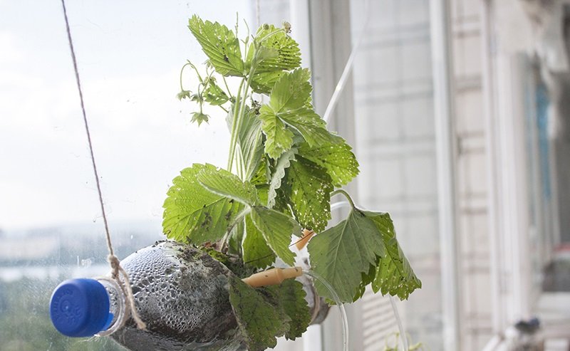- Muchos jardineros están felices de usar este método en el cultivo de fresas. Hay muchas ventajas: las malas hierbas no molestarán, se reducirá el riesgo de enfermedades de las plantas y la baya prácticamente no necesitará ser rociada. Habiendo hecho una estructura tan simple a partir de una botella de plástico, puedes obtener una buena cosecha en el balcón.