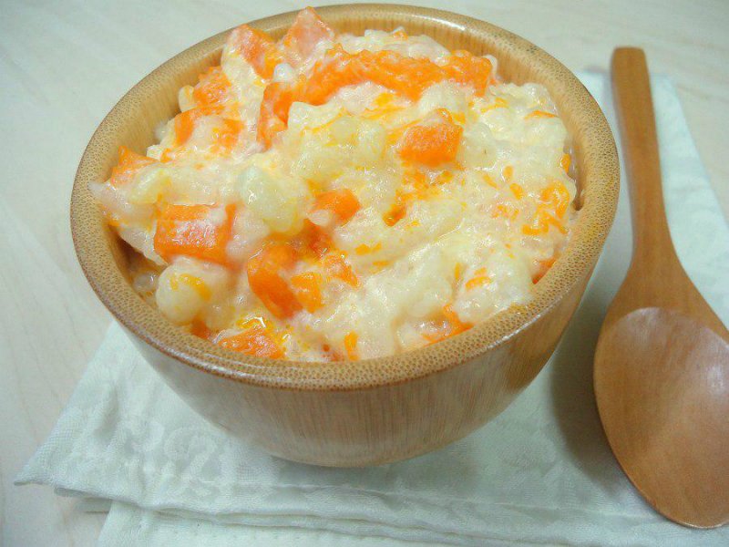 Enjuaga 50 g de arroz, rellénalo con agua en proporción de 1: 2, sala al gusto y prende fuego. Mientras tanto, ralla una rodaja de calabaza (100 g es suficiente), agrégale una cucharada de agua, ponla a hervir con la tapa puesta durante 5-7 minutos. Cuando la calabaza se ablande, agréguela al arroz, échale un vaso de leche y cocínala por unos 10 minutos. Sírvela con un poco de mantequilla.