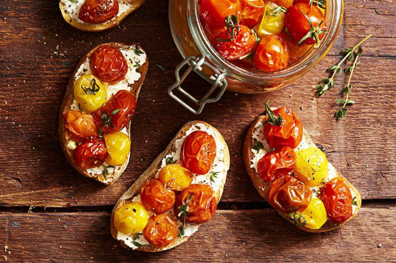Una alternativa a los tomates cocidos y secados al sol. Corta los tomates cherry (500 g) por la mitad, ponlos en una bandeja para hornear con la rodaja hacia arriba, rocía con aceite de oliva, espolvorea con tomillo seco, sal, pimienta y ajo seco y hornea a 180 grados, hasta que marchiten. Úsalos para preparar sándwiches, pastas, o como aperitivo para la carne.