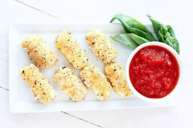 300 g de queso (mozzarella u otro de tu agrado) cortados en cubos pequeños, ponlos en el congelador durante unos 15 minutos. Mezcla las migas de pan con hierbas aromáticas a tu gusto, y en un recipiente aparte, bate el huevo con 1 cucharada de leche. Pasa los trozos de queso congelados primero por harina, luego sumérgelos en el huevo y después en pan rallado. Ponlos en una bandeja para hornear cubierta con pergamino. Y hornea por 10-15 minutos a 200 grados. ¡Listo!