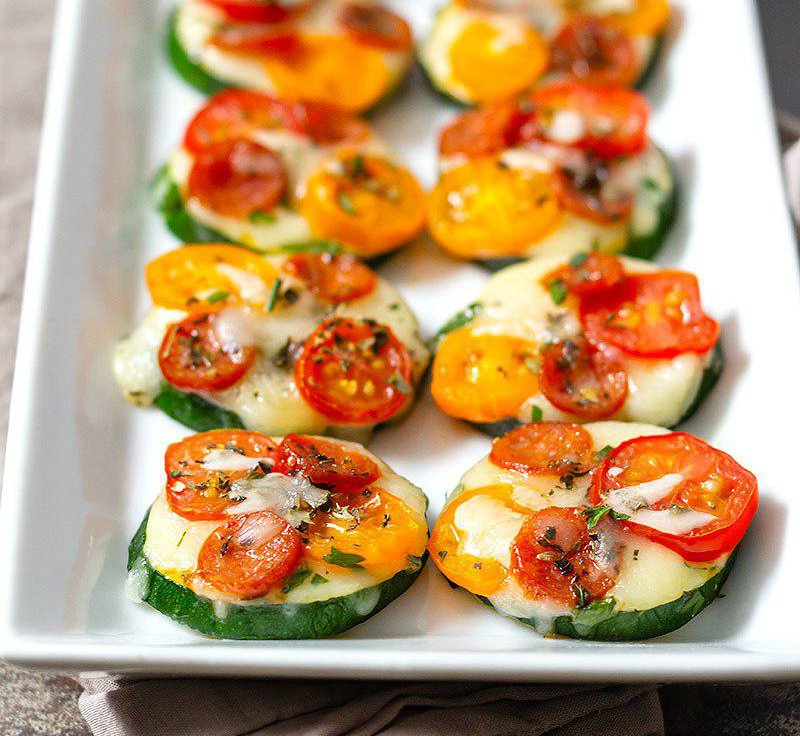 En una bandeja para hornear cubierta con pergamino, coloca círculos de calabacín, encima ponles queso y unas rodajas de tomate cherri. Luego, al horno por 15 minutos a una temperatura de 200 grados. ¡Deliciosos!