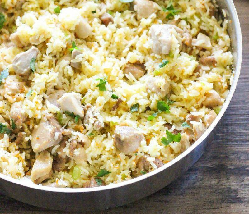 Corta el pollo en trozos, fríelo en una sartén profunda con aceite de oliva. Agrégale cebollas picadas finamente, y fríe un poco más. Vierte el arroz lavado en la sartén, agrégale sal y mezcla. Vierte suficiente agua o caldo, enciende el fuego y cocínalo con la tapa puesta durante 15-20 minutos.