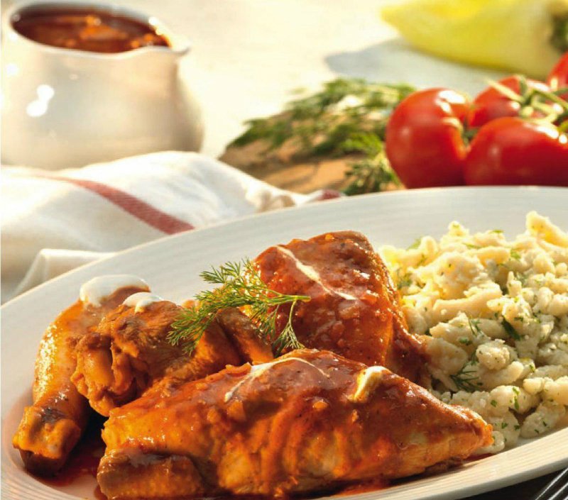 Fríe las cebollas en una sartén profunda, agrégale el filete de pollo, picado lo suficientemente grande. Saltéalo hasta que esté ligeramente dorado. Agrégale rodajas de pimiento y tomate, ajo. Sazona con paprika molido y pimienta negra, vierte un poco de agua y cocínalo a fuego lento bajo la tapa durante 20-30 minutos, hasta que la carne esté lista. Sírvelo con crema agria y su guarnición favorita.