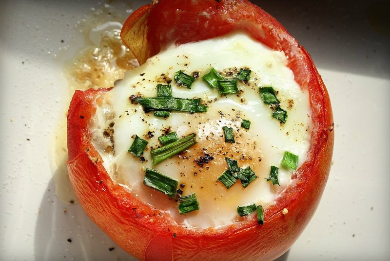 Mediante simples manipulaciones, un huevo frito común se puede convertir fácilmente en un plato original e interesante. Solo necesitas elegir los tomates más grandes, extraer su núcleo y llenarlos con jamón picado (salchichas, tocino, filete de pollo hervido) con hierbas. Rómpele un huevo encima, échale sal, pimienta, espolvoréale queso rallado, si lo deseas. Unos 10-15 minutos a una temperatura de 180 grados en el horno serán suficientes. Mientras tanto, prepara el té.