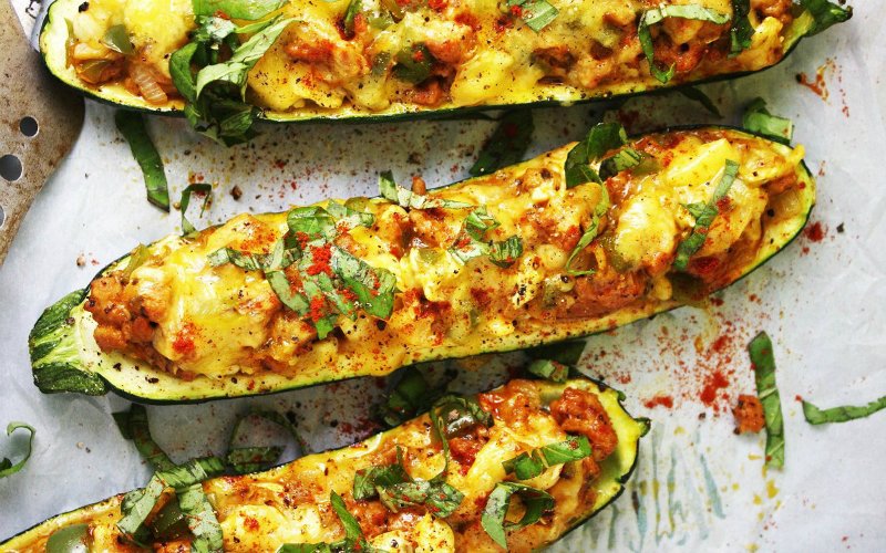 De acuerdo con el principio de la receta descrita anteriormente, prepara el plato en botes de calabacín. ¡Obtendrás una dieta mucho más rica!