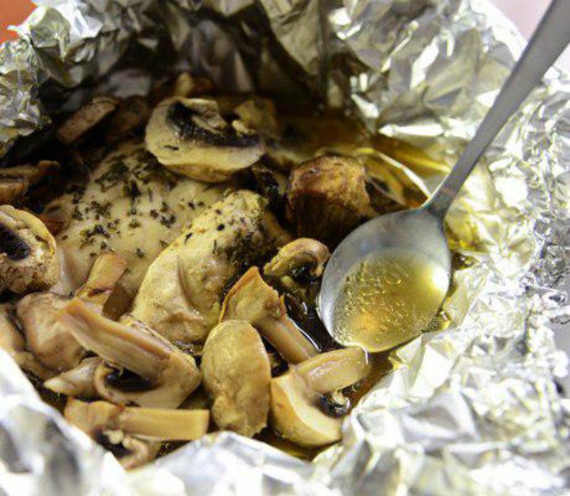 Corta los champiñones en rodajas medianas. Corta el filete de pollo grueso. Pica la cebolla. Dobla una hoja de papel de aluminio por la mitad y levanta los bordes. Pon el pollo, los champiñones y las cebollas, échale aceite de oliva, vino blanco, sal, pimienta, Une el borde del papel aluminio y ponlo en el horno durante 30 minutos a 180 grados. ¡Se me hace la boca agua!