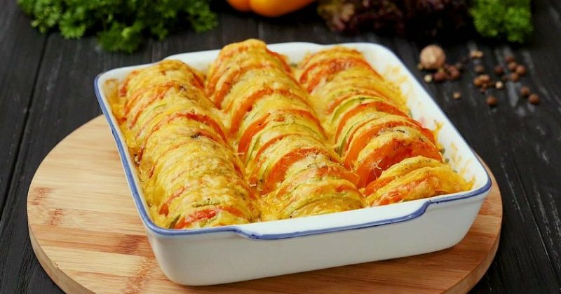 Corta en rodajas el calabacín, los tomates y papas, y ponlos en una fuente para horno, alternando entre sal, pimienta. Cúbrela con papel de aluminio, hornea durante 20 minutos a 200 grados. Retira la fuente y el papel de aluminio, espolvorea verduras con queso rallado, y devuelve la fuente al horno durante otro minuto. ¡Fácil verdad!