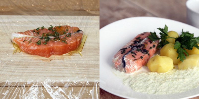 Limpia las papas, tápalas con agua, adiciónale sal, prende fuego y cocínalas. Coloca el filete de pescado en una envoltura de plástico, échale jugo de limón, tu vino blanco favorito, échale alguna especia, sala al gusto, ponlo en la olla con las papas y tápalo, para que el pescado se cocine al vapor. Cocina por 20–25 minutos más.