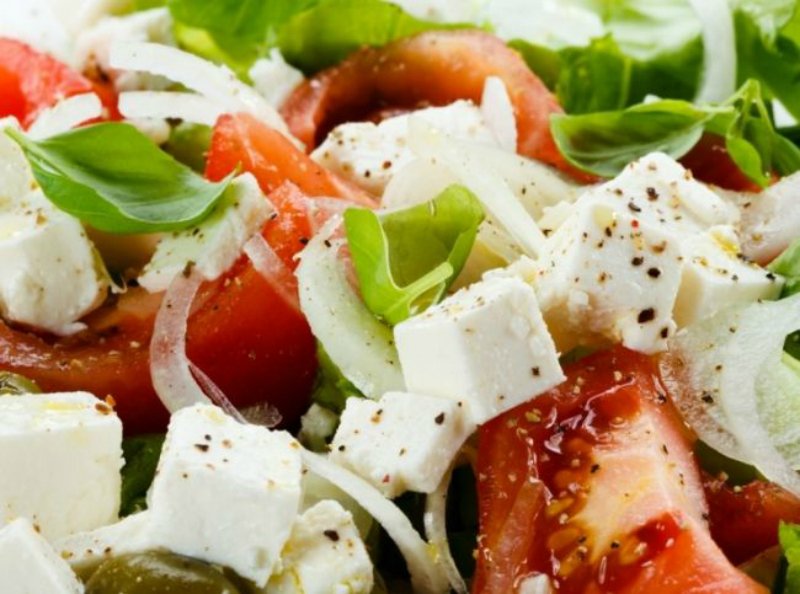 Corta en rodajas medianas los tomates, pepinos, pimientos y queso feta, sazona con sal, jugo de limón y aceite de oliva. Es muy sencilla. ¡Disfrútala!