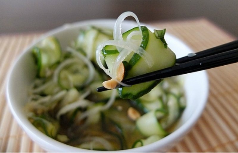 Corta los pepinos en círculos, agrégale aros finos de cebolla y nueces picadas. Sazona con salsa de soja, aceite de oliva y jugo de limón. ¡Muy ligera!