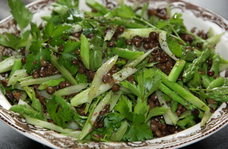 A las lentejas verdes hervidas, agrégale el tallo de apio picado y perejil. Sazona con una mezcla de jugo de limón, vinagre de vino y aceite de oliva. ¡Ya está!
