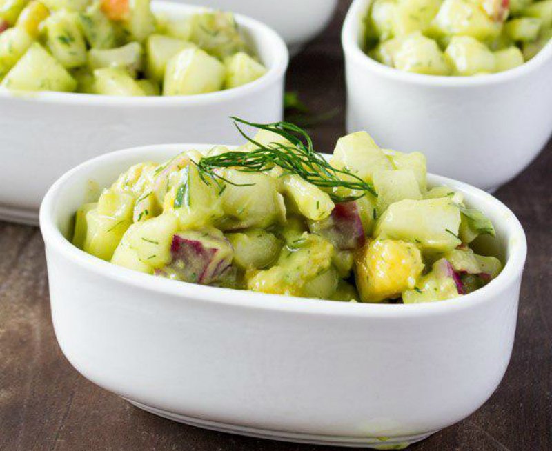 Corta en dados el pepino, el durazno (sin piel) y aguacate. Agrégale medios aros finos de cebolla y eneldo picado. Sazona con una mezcla de vinagre de manzana, aceite de oliva y jugo de limón.