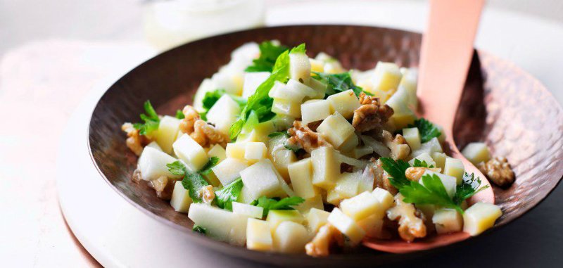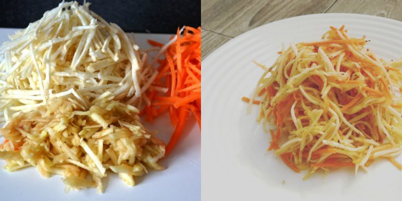 Ralla una manzana mediana, una zanahoria y un cuarto de raíces de apio, sala al gusto. Sazona con vinagre de manzana, aceite vegetal y mezcla. ¡Muy rápido!