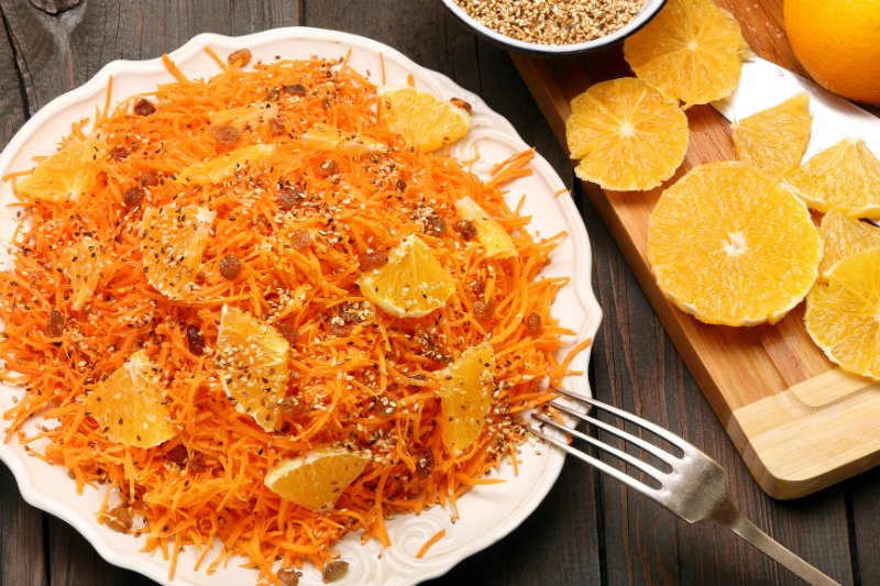 Ralla una zanahoria y luna manzana, agrega rodajas de naranja peladas, un puñado de nueces y pasas. Sal al gusto, vierte aceite vegetal y una cucharada de miel. Revuelve, deja reposar por 10 minutos.