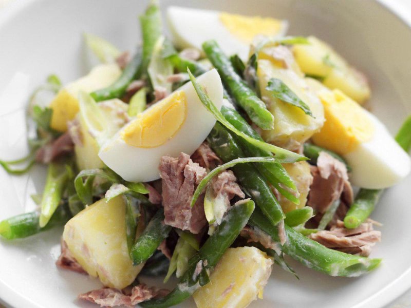 Vierte el jugo de atún enlatado, pon la carne en un plato, agrégale las papas cortadas en cubitos y las rodajas de huevo cocido. Sazona con jugo de limón, aceite vegetal, sal, pimienta.