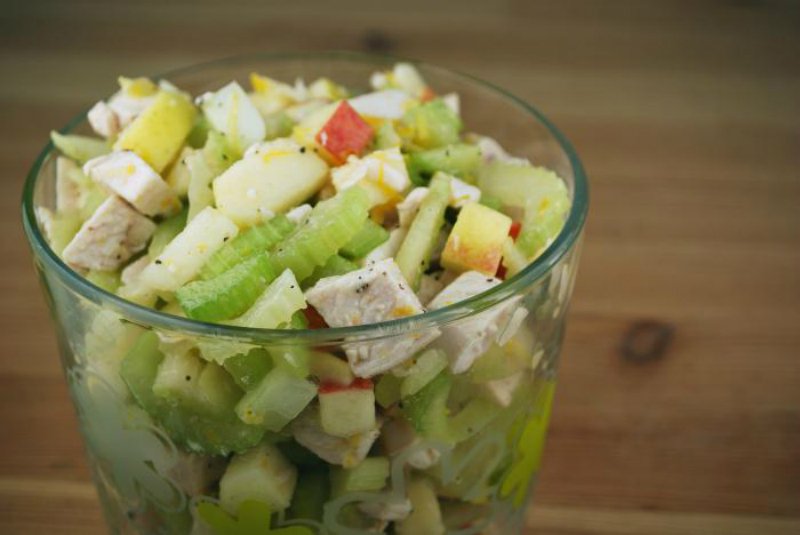 Corta el filete de pollo hervido en rodajas medianas, corta las manzanas en cubos y el tallo de apio en rodajas. Sazona con jugo de limón, aceite de oliva, espolvorea con hierbas, sal y pimienta. Revuelve, deje que la ensalada repose.