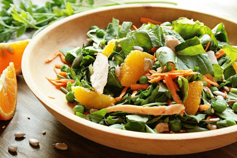 Dora las rebanadas de pollo en una sartén, mezcla con hojas verdes y rodajas de naranja. Agrégale trozos de queso feta triturado, un poco de sal, sazona con una mezcla de jugo de limón, miel y aceite de oliva.