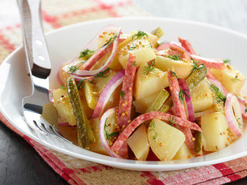 Corta en dados las papas hervidas, agrégale pepinos encurtidos, cebollas y salami, en rodajas. Sazona con mostaza Dijon, vinagre de vino, aceite vegetal, sal, pimienta al gusto.