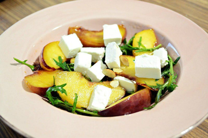 Corta los duraznos, agrégale los cubos de queso feta y hojas de rúcula. Sazona con miel, vinagre balsámico, aceite vegetal y sal.