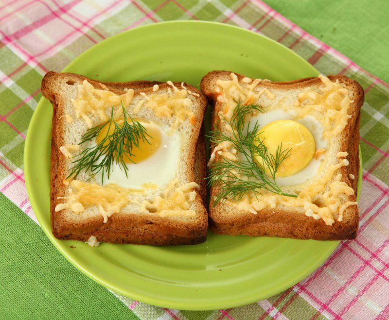 Haz agujeros redondos en las rebanadas de pan para tostadas (del diámetro de un vaso). Lubrica la sartén con mantequilla, fríe el pan por un lado y voltéalo con cuidado para que no se rompa, y pon un huevo en el agujero de la rebanada. Añade sal, pimienta y otros condimentos a tu gusto. Cocínalo tapado, hasta que el huevo se ponga duro y quede atrapado.