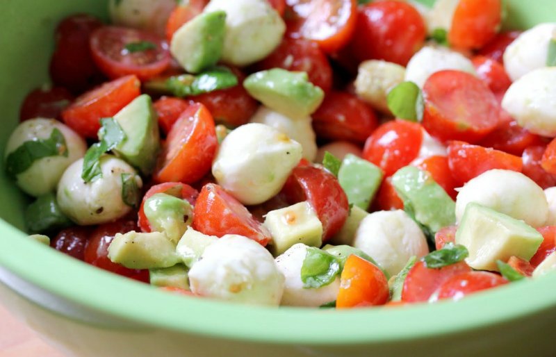 Rebana los tomates, el aguacate y la mozzarella, agrégale la albahaca picada. Sal y pimienta al gusto. Sazona con una mezcla de aceite de oliva y jugo de limón, mezcla.