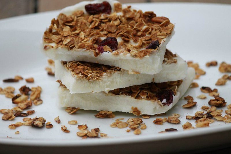 Mezcla yogur natural sin aditivos (500 ml) con miel y coco. Vierte la masa en una forma rectangular, espolvorea con avena y chispas de chocolate. Ponlo en el congelador durante 2 horas, luego retíralo y córtalo en cuadrados pequeños.