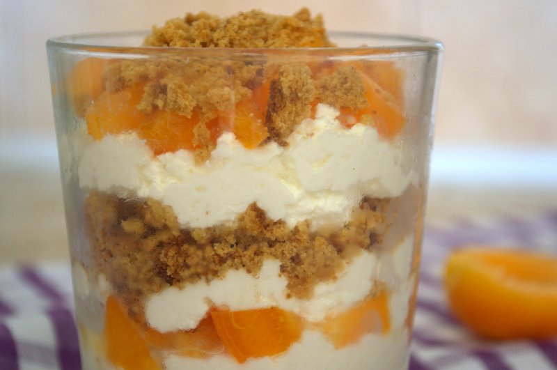 Muele las galletas de mantequilla en migajas, bate el requesón con azúcar y pica las frutas. Coloca los ingredientes en capas en un tazón.
