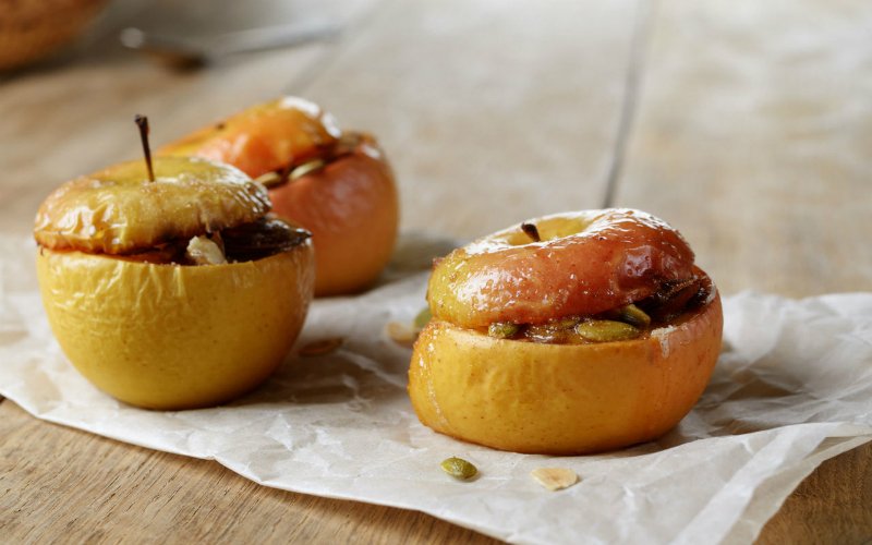 Corta el centro de semillas de las manzanas, luego llénalas con nueces picadas, viértele miel. Colócalas en una bandeja para hornear engrasada con mantequilla. Hornea hasta que estén cocidas.