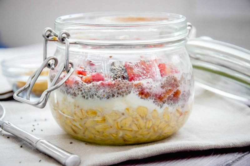 Por la noche, vierte unas cucharadas de avena tierna en un frasco de 0.5 litros, agrega nueces, pasas y semillas de lino y vierte el yogur. Agítalo y cierra la tapa, ponlo en el refrigerador. Sácalo por la mañana y agrégale una cucharada de miel o puré de frutas. ¡Un desayuno saludable y nutritivo sobre la mesa!