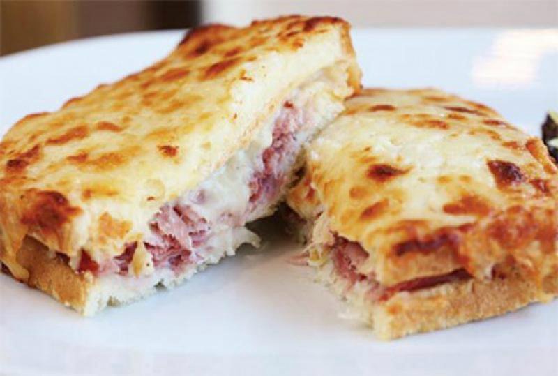Coloca rebanadas de pan para tostadas, untadas con una mostaza suave, en una bandeja para hornear, ligeramente engrasada. Coloca una rebanada de queso duro y jamón sobre el pan, cúbrela con un segundo pedazo de pan. Lubrica con aceite de oliva, espolvoréala con queso y hornéala hasta que se dore.