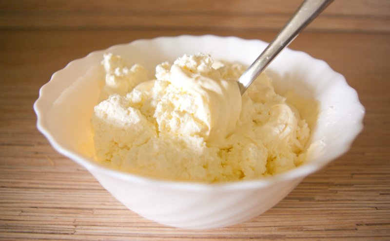 A 100 g de requesón medianamente líquido, agrégale 1-2 cucharadas de crema agria o yogurt, bátelo con una licuadora. Agrégale miel al gusto y rodajas de fruta de temporada. Puedes no usar miel y reemplazar la fruta con tu mermelada favorita.