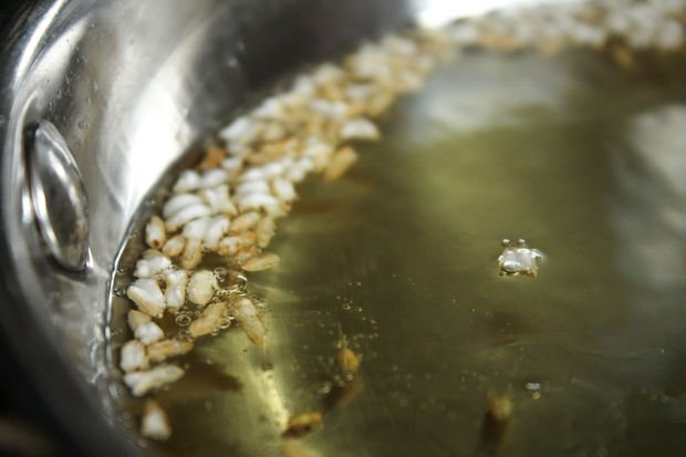 Si echas unos granos de arroz en la sartén con mantequilla, y estos se hunden, es que todavía está fría. ¡Si al caer, empieza a burbujear, significa que el aceite ya alcanzó la temperatura deseada, y puedes empezar a freír de manera segura! ingenioso método, y sin salpicaduras.