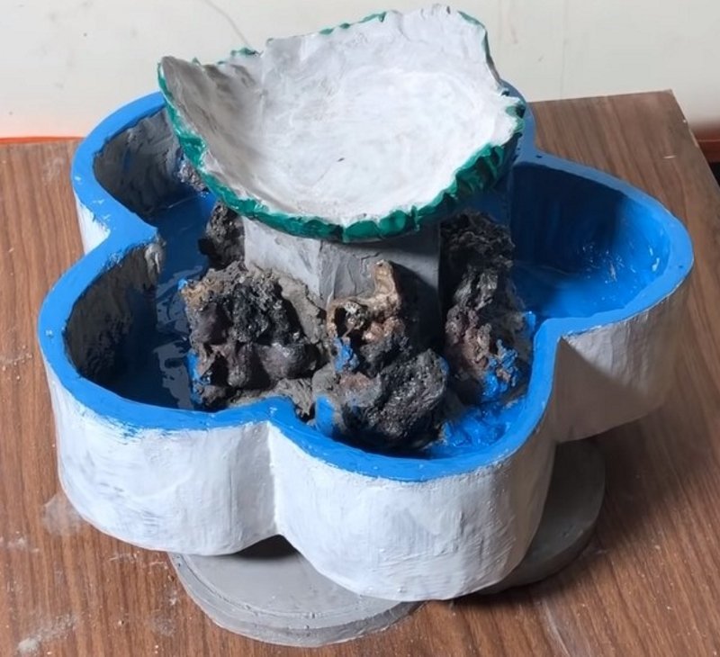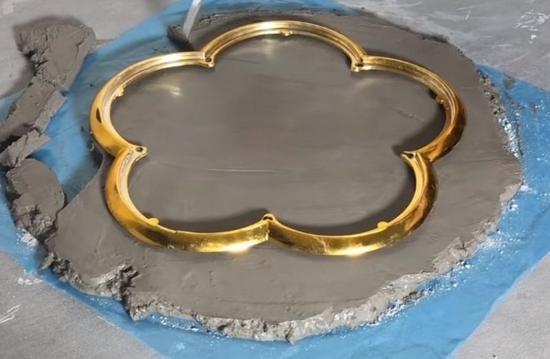 - Ahora, pon un poco de mortero en el medio de la flor seca, hecha de concreto, y coloca objetos de igual altura en los bordes, para que se detengan.