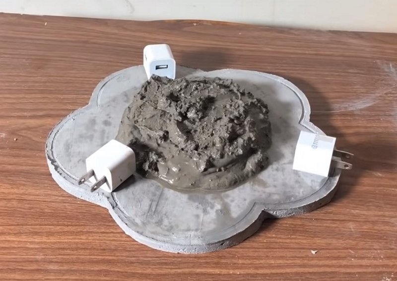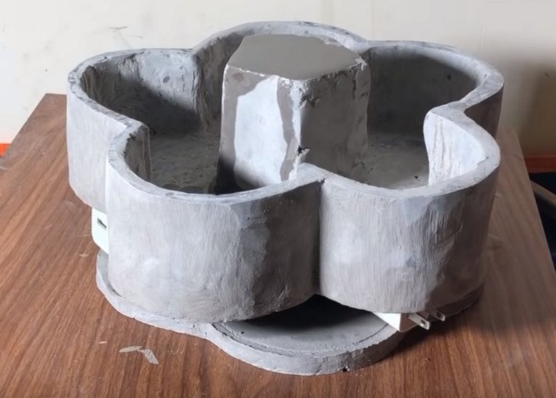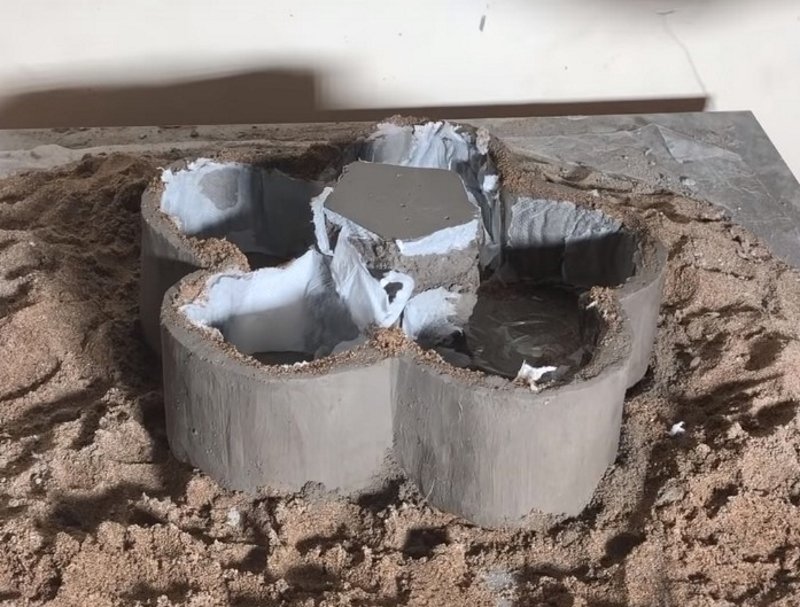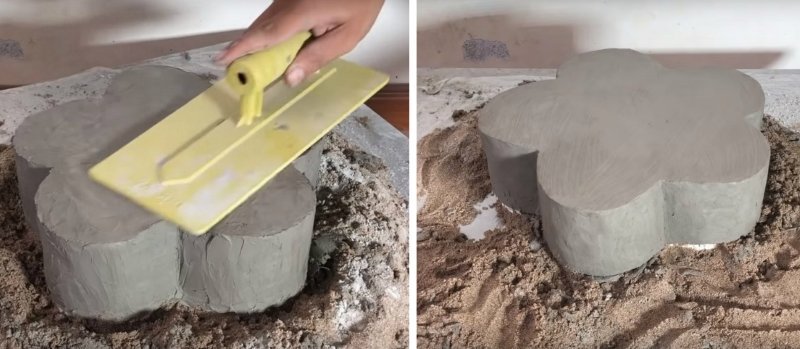 - Ahora, pon un poco de mortero en el medio de la flor seca, hecha de concreto, y coloca objetos de igual altura en los bordes, para que se detengan.