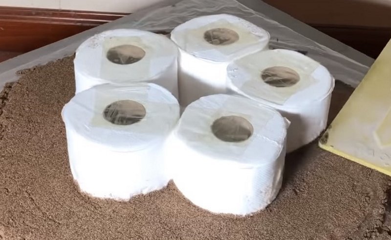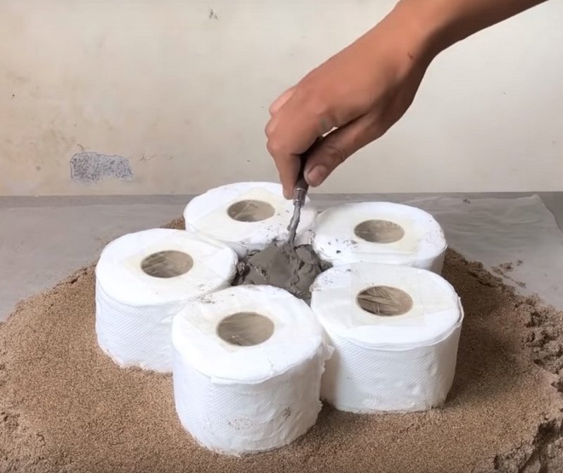 En primer lugar, debes preparar todo lo que necesitarás: 5 rollos idénticos de papel higiénico, cemento, arena, cinta adhesiva, espátula, pintura, un plato alto, una forma de flor y una gran hoja verde.