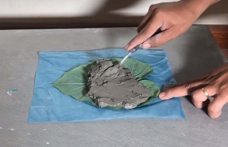 - Extiende la película, coloca una hoja verde grande en la parte superior y cúbrela con una mezcla.