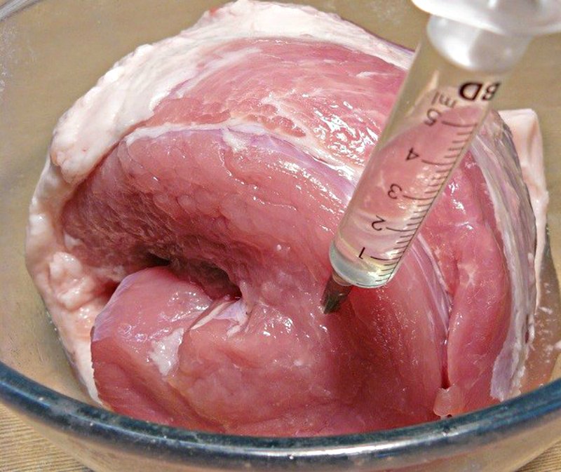 - Succiona la salmuera ya fría con una jeringa grande, e inyéctala en la carne por todos lados. Es importante hacerlo en todo el espesor, para que no se afecte la jugosidad y el sabor del futuro jamón.