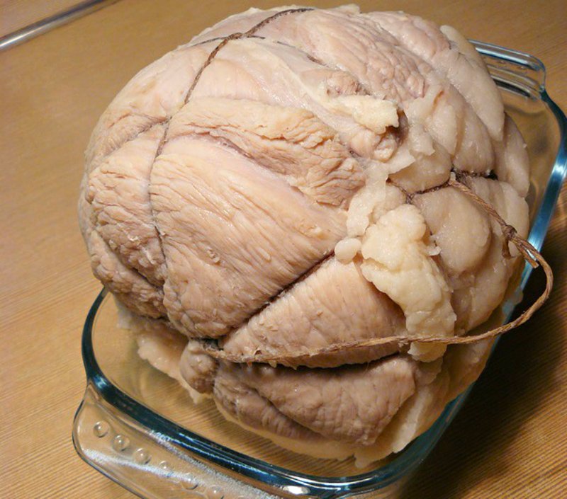 - A fin de que el jamón se cocine bien, cocínalo en agua hirviendo. Ajusta la temperatura a 80 grados (comienza a evaporar activamente). Baja el fuego al mínimo, pon la carne en una olla, y déjala allí por 2 horas y media. No permitas que la temperatura suba. Pasado ese tiempo, introduce el jamón en agua fría, para enfriarlo completamente, y mantenlo en frío durante dos horas más.