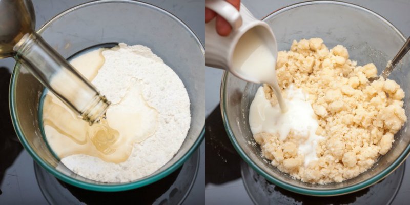 - En un recipiente de gran capacidad, tamiza la harina y el bicarbonato de sodio, y añádele el azúcar. Viértele el aceite vegetal, y mezcla bien.