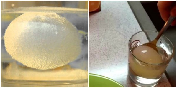 - Extrae el huevo cuidadosamente con una cuchara (tratado con el vinagre, será semejante a un huevo hervido) y colócalo en el otro recipiente. La fina película, remuévela. Bate el huevo con una cuchara, añadiendo el sedimento que se formó en el fondo del vaso, graciás a la acción del vinagre.
