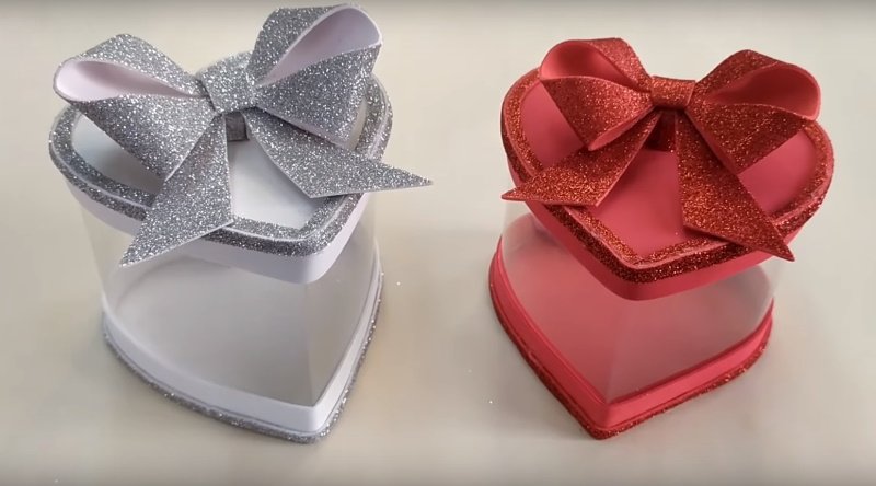 Una opción maravillosa para una caja de regalo hecha con tus propias manos. ¡Nadie pensaría que proviene de una botella! Corta la botella por el medio, dobla por la mitad y pega en el centro, dándole la forma deseada (corazón, cono, cuadrado). Con un cartón denso, haz el fondo y la tapa de la caja, y péguelos al plástico. Luego, con papel o cinta de color, cierra los bordes del encolado, y decora la caja con lazos, cuentas o flores de tela.