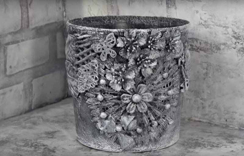 Si has estado arrojando cubos de plástico todo este tiempo, solo echa un vistazo a la siguiente foto. Bueno, ¿no querías una maceta de diseño? Solo necesitarás pintura, una pieza de arpillera, pegamento y flores decorativas.