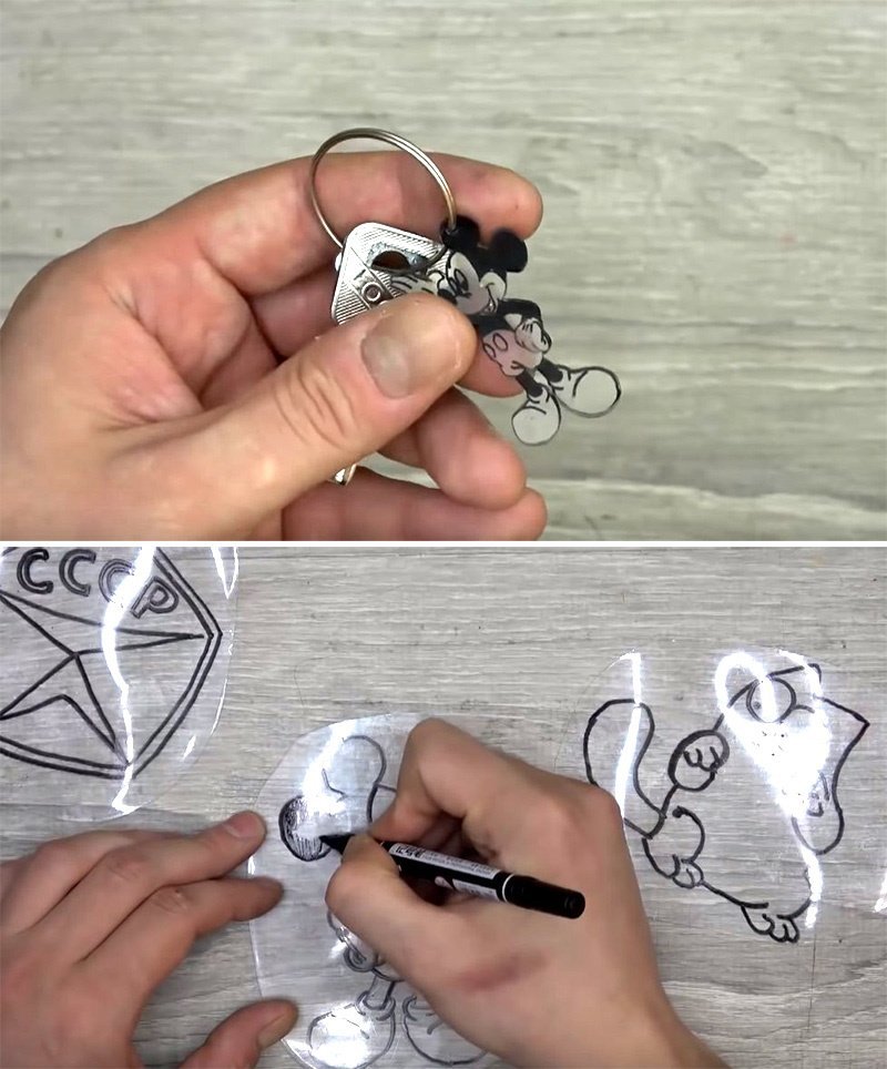 De las tapas de los envases desechables de comida pueden salir lindos llaveros. Con un marcador, traza el dibujo que te gusta por la superficie de la tapa, y envía este estuche al microondas durante 5 minutos. Un patrón plano en los ojos disminuirá 3 veces y se volverá más grueso. Con una aguja caliente, haz un pequeño agujero para el llavero. ¡Muy original, ahora las llaves serán más fáciles de encontrar! Si lo deseas, puede pintar los llaveros con barniz o pintura acrílica, y regalarlos a tus amigos.