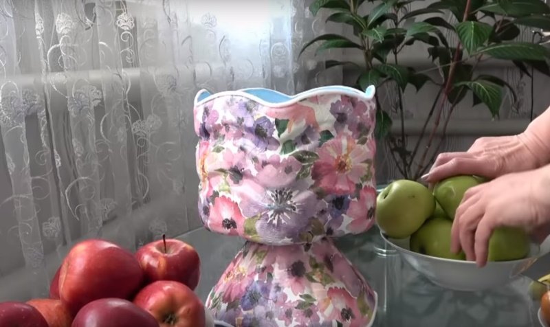 ¿Conoces la técnica de cache-pot? Necesitarás una botella de 5 litros, pegamento, cinta adhesiva y hermosas servilletas. Corta la botella por la mitad, corta los bordes en una forma ondulada para que se vea divertido. Pinta las partes con pintura blanca y pega la servilleta: coloca la servilleta en la botella y unta sobre el PVA. Luego, conecta las dos partes, como en la imagen, y pega una cinta alrededor del borde para obtener mayor belleza.
