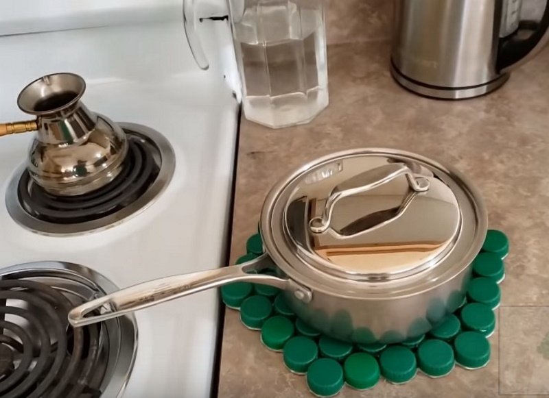 Puedes crear una alfombra en el pasillo o un puesto de calor en la cocina. Haz un respaldo de cartón de la forma deseada (en este caso, es un hexágono). Pega las tapas alrededor del perímetro completo. Puede hacer una alfombra simple o combinar tapas multicolores.