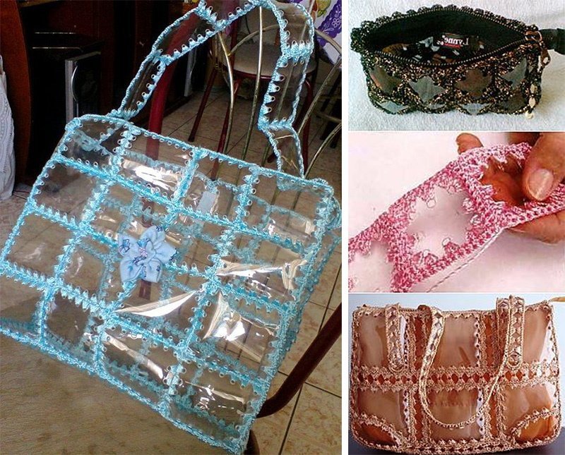 Solo las chicas más valientes llevan bolsos transparentes. A partir de envases de plástico o botellas (todos deben ser del mismo color y grosor), puedes hacer un bolso o una bolsa de cosméticos única y original. Necesitas los mismos cuadrados de plástico, hacer agujeros en ellos y tejerlos juntos.