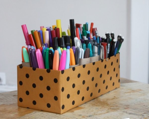 - Este es quizás el organizador de papelería más sencillo del mundo: ¡simplemente inserta los bujes en una caja de cartón y clasifica los accesorios en celdas!