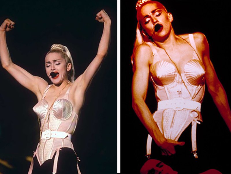 El diseñador transformó el corsé ajustador, para que se viera como un símbolo de la potencia sexual, presentando el cuerpo de una mujer no como objeto de la excitación sexual, sino como una expresión agresiva. Los sujetadores más memorables que usó Madonna, eran de seda color rosa y oro.